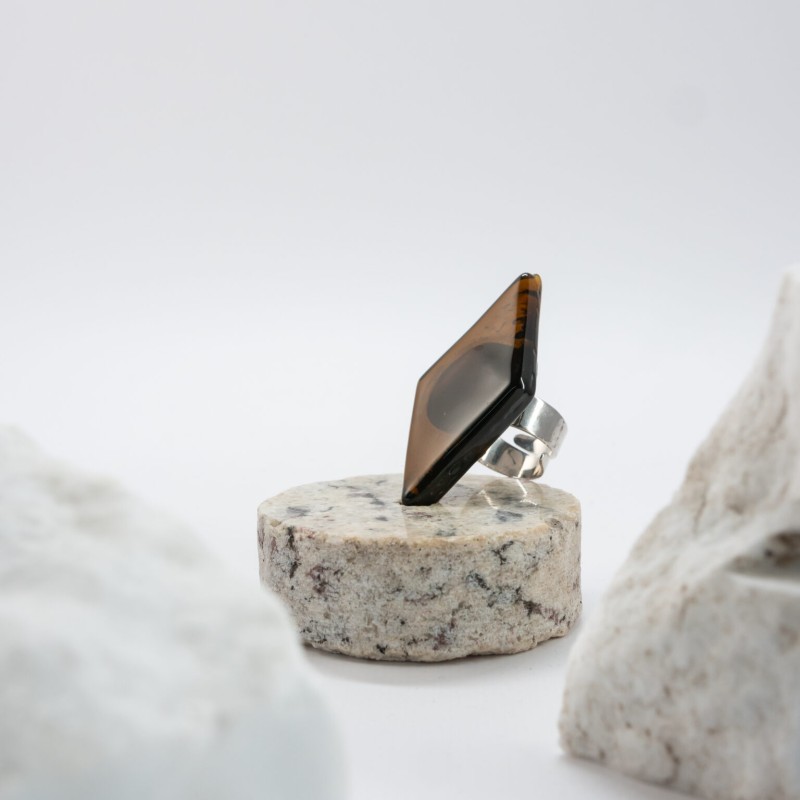 Glass brown rhombus on a silver-plated metal adjustable base. All metal elements are hypoallergenic and nickel free.