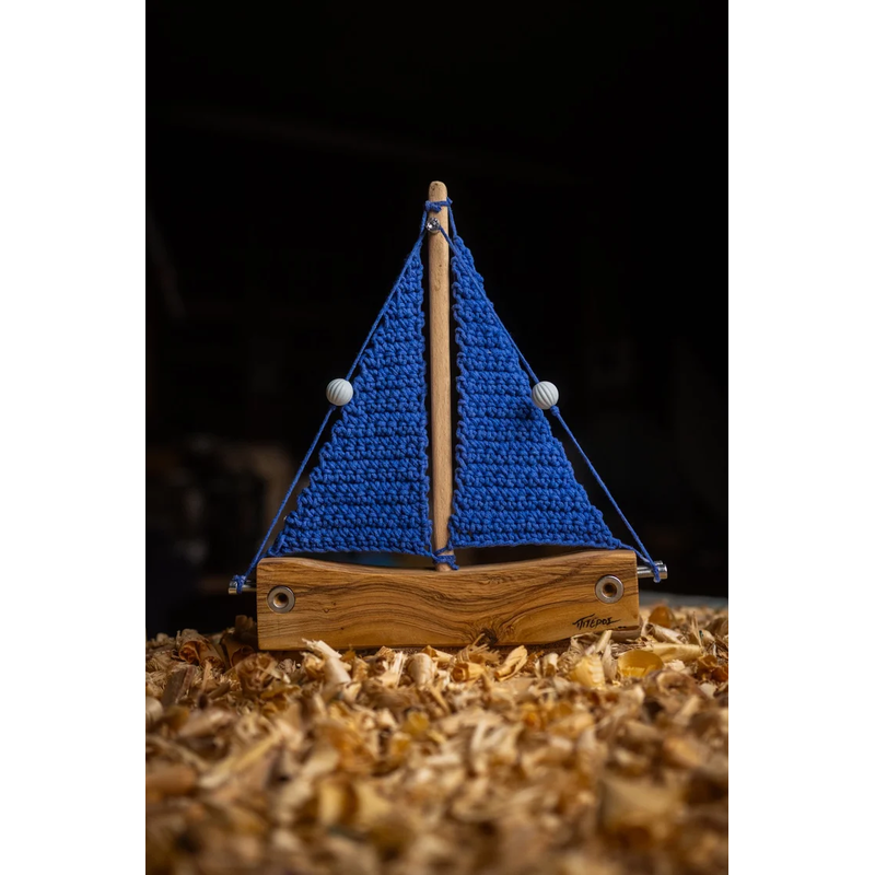 Olive wooden boat with knitted sails blue colour A06. Dimensions 23x30x3,5cm / 250gr